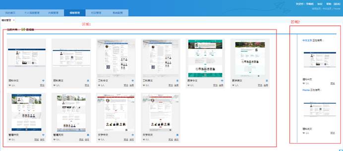 模板管理界面可分为两个区域,区域1:显示所有模板,区域2:显示您已使用的模板。