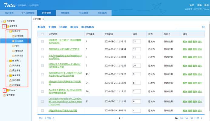 如上图所示,列表上的‘论文成果’栏目是点击“新增”创建的;其他栏目如:‘招生信息’、‘获奖信息’等栏目是系统默认给您主页显示的栏目,默认栏目您可以根据您自己的需求进行修改删除,如果是默认栏目并且是必须显示的栏目,则不允许删除(如图6中的:‘首页’)。