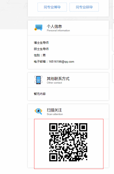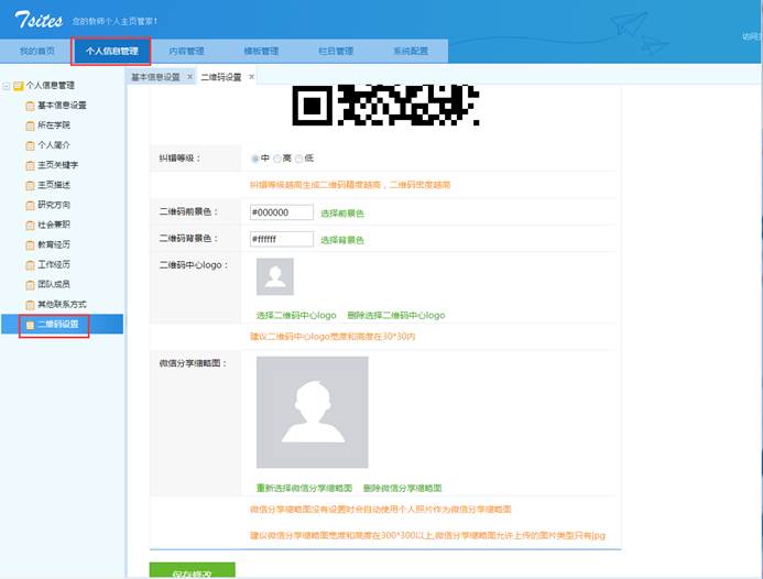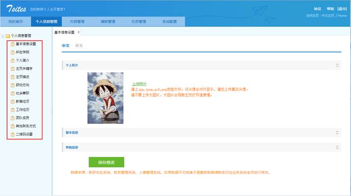 ”,页面左侧会显示出与您相关的一些基本信息分类(基本信息设置、所在学院,研究方向,社会兼职、教育经历、工作经历、团队成员、其他联系方式,二维码设置),这些分类下的信息会在您的主页中展示,请您认真完善。