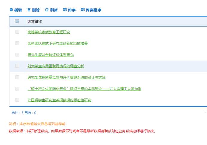 数据来源有两种,一种如图7所示,您自己添加的数据,您可以根据您的需求进行编辑;另一种是如图8所示,从业务系统导入的数据,这部分数据标题前面的选择框都是灰色的,不能进行删除和再编辑。针对系统导入的这部分数据,如果有错误,请根据数据来源说明,联系对应的业务系统老师,进行数据修改。