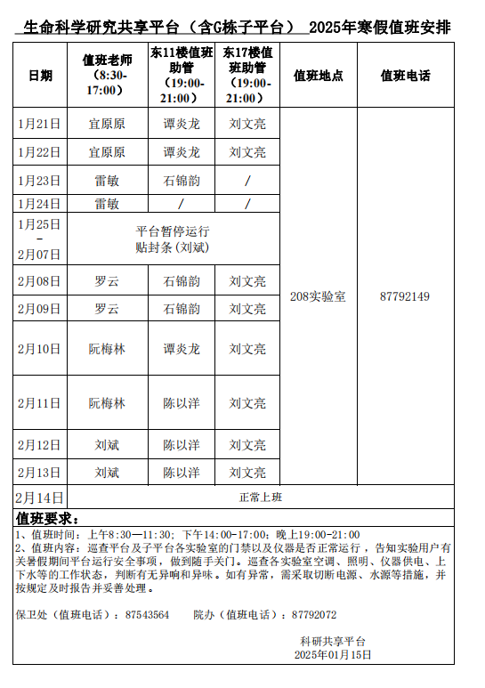 2、值班内容:巡查各实验室的门禁,告知实验用户有关寒假期间平台运行安全事项,做到随手关门 。巡查各实验室空调、照明、仪器供电、上下水等的工作状态,判断有无异响和异味。如有异常,需采取切断电源、水源等措施,并按规定及时报告并妥善处理。