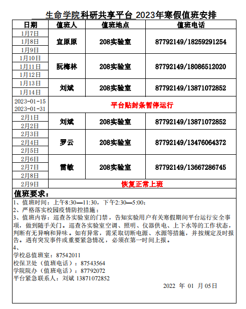 2023年寒假实验动物中心运行安排表 2023寒假实验动物中心运行安排.doc