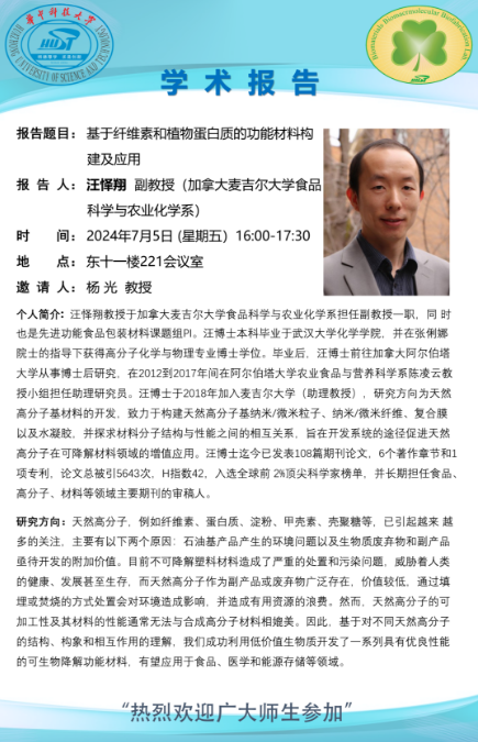 报告题目:基于纤维素和植物蛋白质的功能材料构建及应用