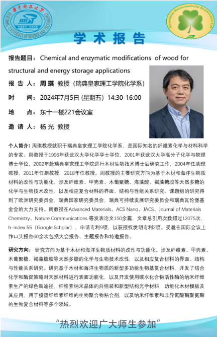 个人简介:周琪教授就职于瑞典皇家理工学院化学系,是国际知名的纤维素化学与材料科学的专家。周教授于1996年获武汉大学化学学士学位,2001年获武汉大学高分子化学与物理博士学位,2002年赴瑞典皇家理工学院进行木材生物技术博士后研究工作,2004年任助理教授,2011年任副教授,2018年任教授。周教授的主要研究方向为基于木材和海洋生物质材料的改性与功能化,涉及纤维素、甲壳素、木葡聚糖、海藻酸、褐藻糖胶等天然多糖的化学与生物技术改性,以及相应复合材料的界面、结构与性能关系研究。课题组的研究得到了欧洲研究委员会,瑞典国家研究委员会,瑞典可持续发展研究委员会和瑞典瓦伦堡基金会的大力支持。周教授在Advanced Materials、ACS Nano、JACS、Journal of MaterialsChemistry、Nature Communications 等发表论文150余篇,文章总引用次数超过12075次h-index 55(Google Scholar),申请专利9项,以获授权发明专利2项。受邀在国际会议上作口头报告60余次包括大会报告、主题报告和特邀报告