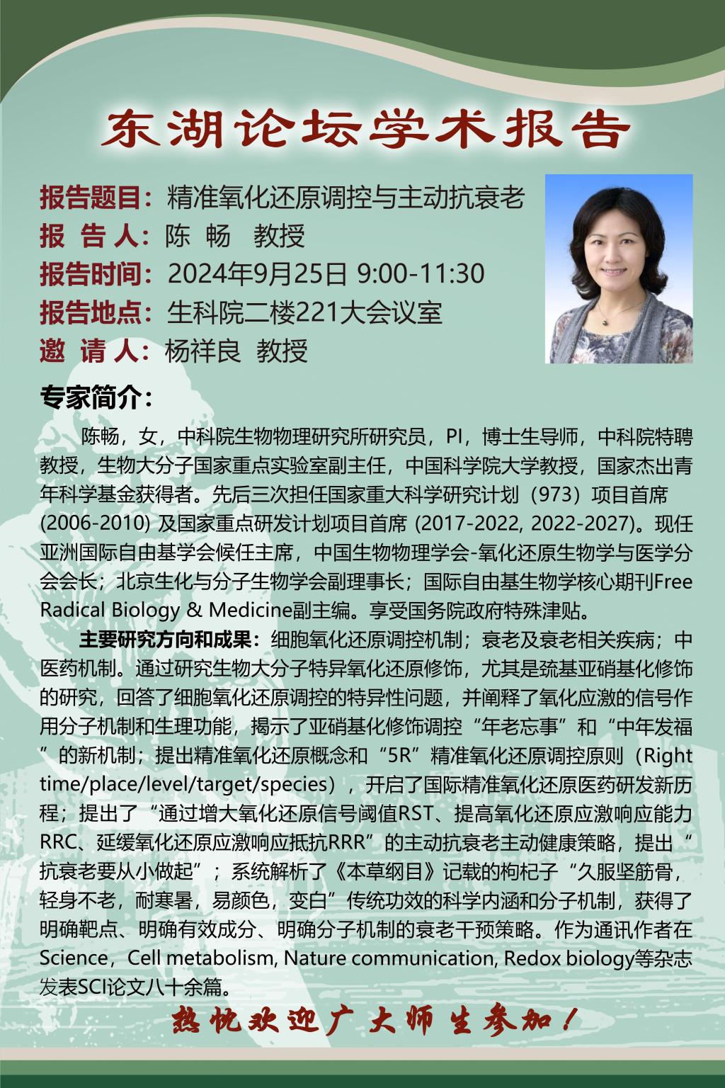 陈畅,女,中科院生物物理研究所研究员, PI,博士生导师,中科院特聘教授,生物大分子国家重点实验室副主任。中国科学院大学教授。国家杰出青年科学基金获得者。先后三次担任国家重大科学研究计划(973)项目首席(2006-2010)及国家重点研发计划项目首席(2017-2022, 2022-2027)。现任亚洲国际自由基学会候任主席,中国生物物理学会-氧化还原生物学与医学分会会长;北京生化与分子生物学会副理事长。国际自由基生物学核心期刊Free Radical Biology&Medicine副主编。享受国务院政府特殊津贴。