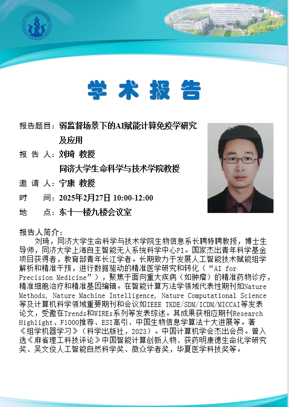 报告题目:弱监督场景下的AI赋能计算免疫学研究及应用 报 告 人:刘琦 教授 同济大学william威廉英国教授 邀 请 人:宁康 教授时 间:2025年2月27日 10:00-12:00地 点:东十一楼九楼会议室