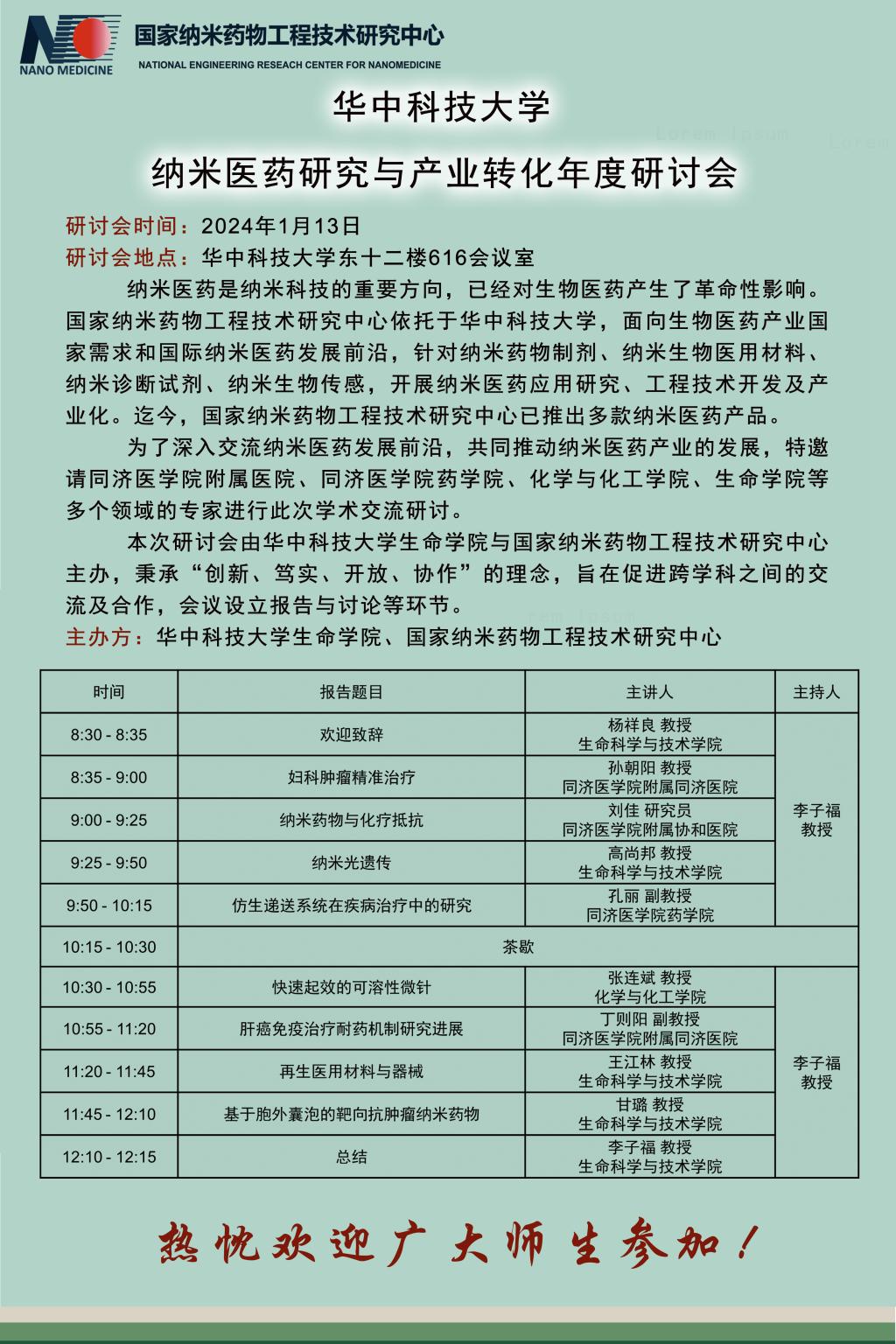 为了深入交流纳米医药发展前沿,共同推动纳米医药产业的发展,特邀请同济医学院附属医院、同济医学院药学院、化学与化工学院、生命学院等多个领域的专家进行此次学术交流研讨。