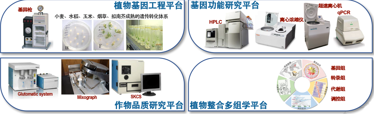 实验室建筑面积约2,000平方米,拥有三间植物生长室、15平方米的低温实验室、150平方米的玻璃温室和300平方米的网室以及试验基地,拥有完备的基因分离、基因表达、作物遗传转化(小麦、水稻、玉米、高粱、烟草)和功能鉴定等研究平台和仪器设备,已形成植物基因工程、基因功能研究、作物品质研究和植物整合多组学四个科研平台。