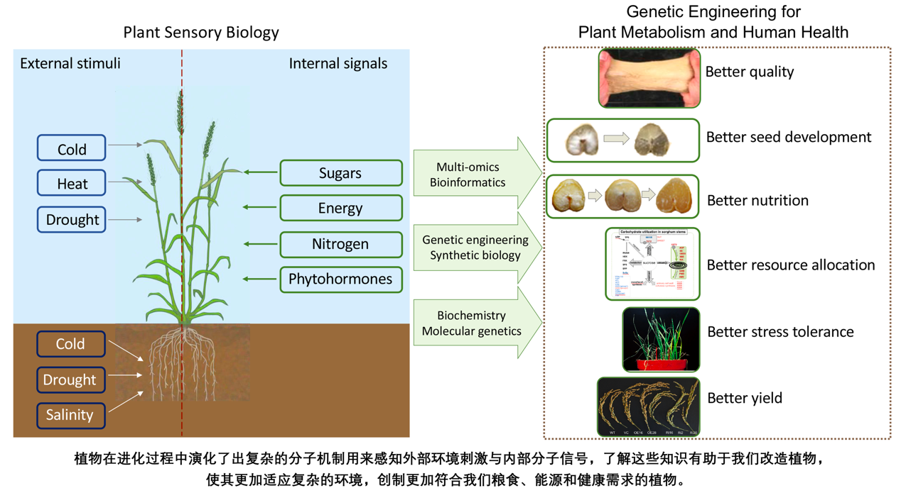 团队聚焦“植物功能基因组学与营养健康”这一核心方向,致力于理解植物感知内外部环境因子的基本过程和分子机制:包括感受外部干旱、盐害、极端温度以及内部的营养和信号分子等。与动物不同,植物因其固着生长特性,进化出了精密而复杂的机制来感受并适应各种不同的内外部环境因子。了解植物对内部营养状态的响应、与外部环境的互动以及在基因表达和代谢水平的调控至关重要,这将为应对气候变化、粮食与能源安全提供潜在的解决方案。团队改良植物对内部能量和代谢的调控以及对外部信号的响应与耐受,进而创制出更加适应气候变化、更加符合营养健康需求和粮食安全的智慧植物。