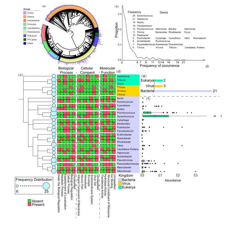 而为什么这些蛋白家族可以被预测出来?这些蛋白家族和微生物组之间有什么关联性呢?研究团队利用先进的数据挖掘方法对预测结果及其所蕴含的生物学意义进行了深入的解读。结果发现微生物组的结构组成和功能分布和预测出的蛋白结构之间存在着很大的关联:首先在微生物组中占有很高比例的物种,在未知蛋白结构的家族中出现的频率也很高。其次,基于结构的蛋白功能预测结果也显示,预测出的蛋白家族的功能也在微生物组中广泛分布,比如光合作用。