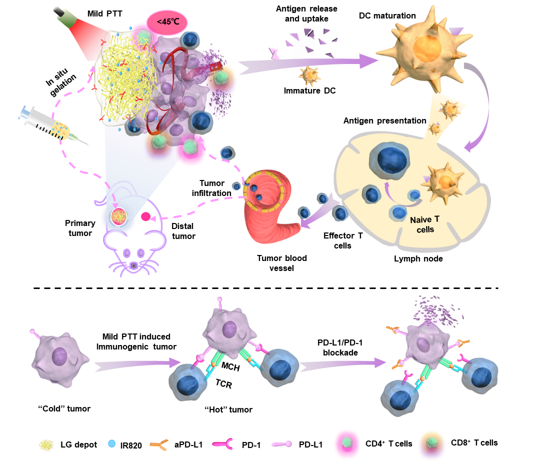 近年来,以CTLA-4 、PD-1/PD-L1通路为代表的免疫检查点抑制剂和CAR-T 的成功,让免疫治疗真正登上了肿瘤治疗的舞台。免疫检查点阻断(ICB)疗法已成为肿瘤治疗的一种重要方法,但对免疫细胞浸润数量不足的“冷肿瘤”效果不佳。将“冷肿瘤”转化为“热肿瘤”的治疗策略是当前ICB疗法研究的前沿热点。原位微温光热治疗(MPTT)则是一把双刃剑,虽然可以有效激活机体免疫,但同时也会上调肿瘤微环境中PD-L1的水平,使肿瘤产生免疫抑制,促进肿瘤生长。