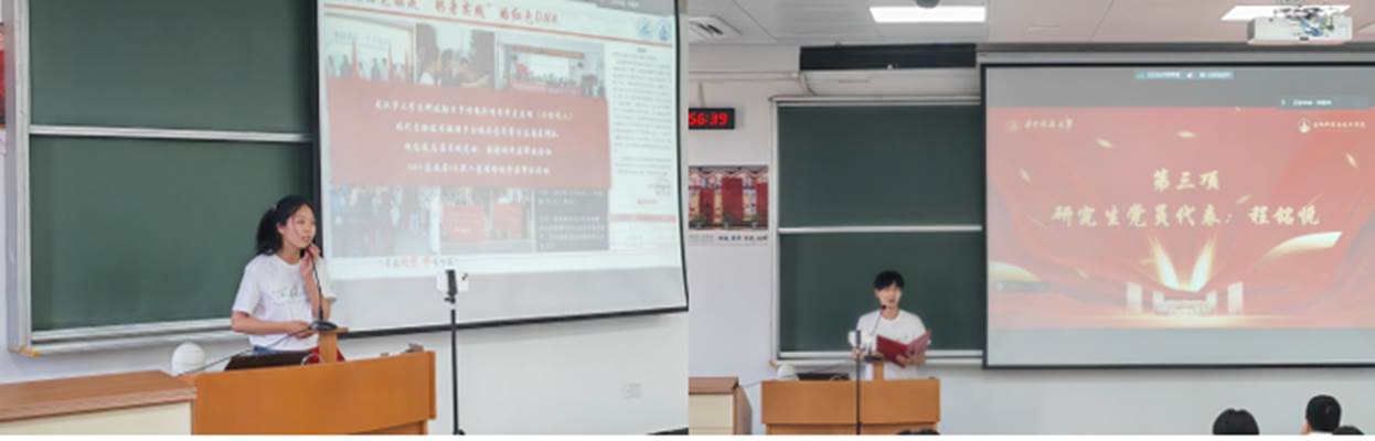 本科毕业生党员代表毕雨欣同学,以“青春向党,毕有可为”为题,从“一心向党”“勤学笃行”“服务师生”“躬身实践”四个方面,分享了她从新生到党员、从学习者到科普讲师、从服务者到组织者、从实践者到引领者,在党的培养和关怀下收获的成长与感动。呼吁全体学生党员,青春在奉献中闪光,要将青春梦融入国家梦,让党的光辉镌刻进生命之书。