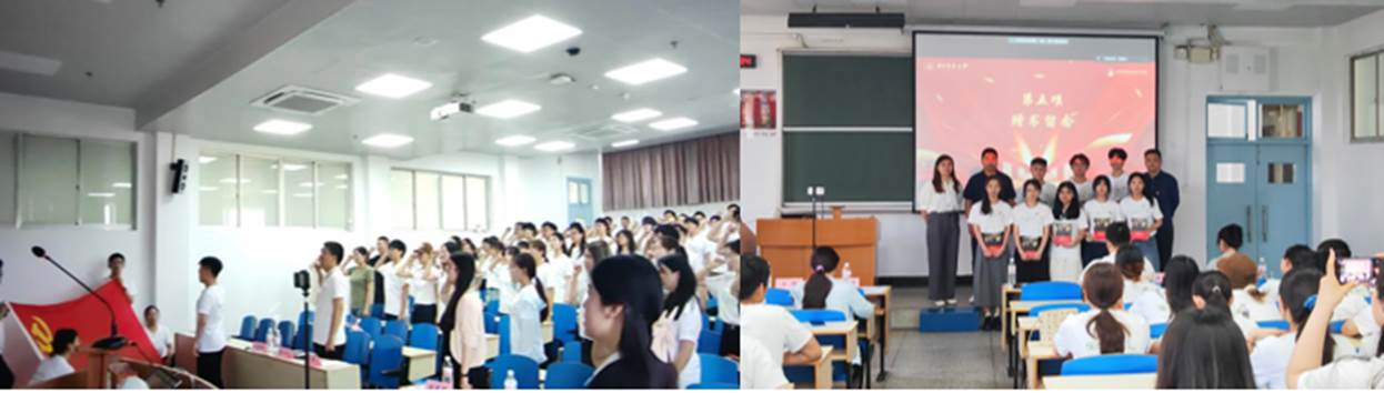 党员代表带领全体党员重温入党誓词,铮铮誓言,字字千钧,感悟入党初心,传承红色基因,自觉接过时代的接力棒。刘笔锋、陈军、安娜为毕业生代表赠书,鼓励大家从书本中汲取力量,在新征程上奋勇向前。
