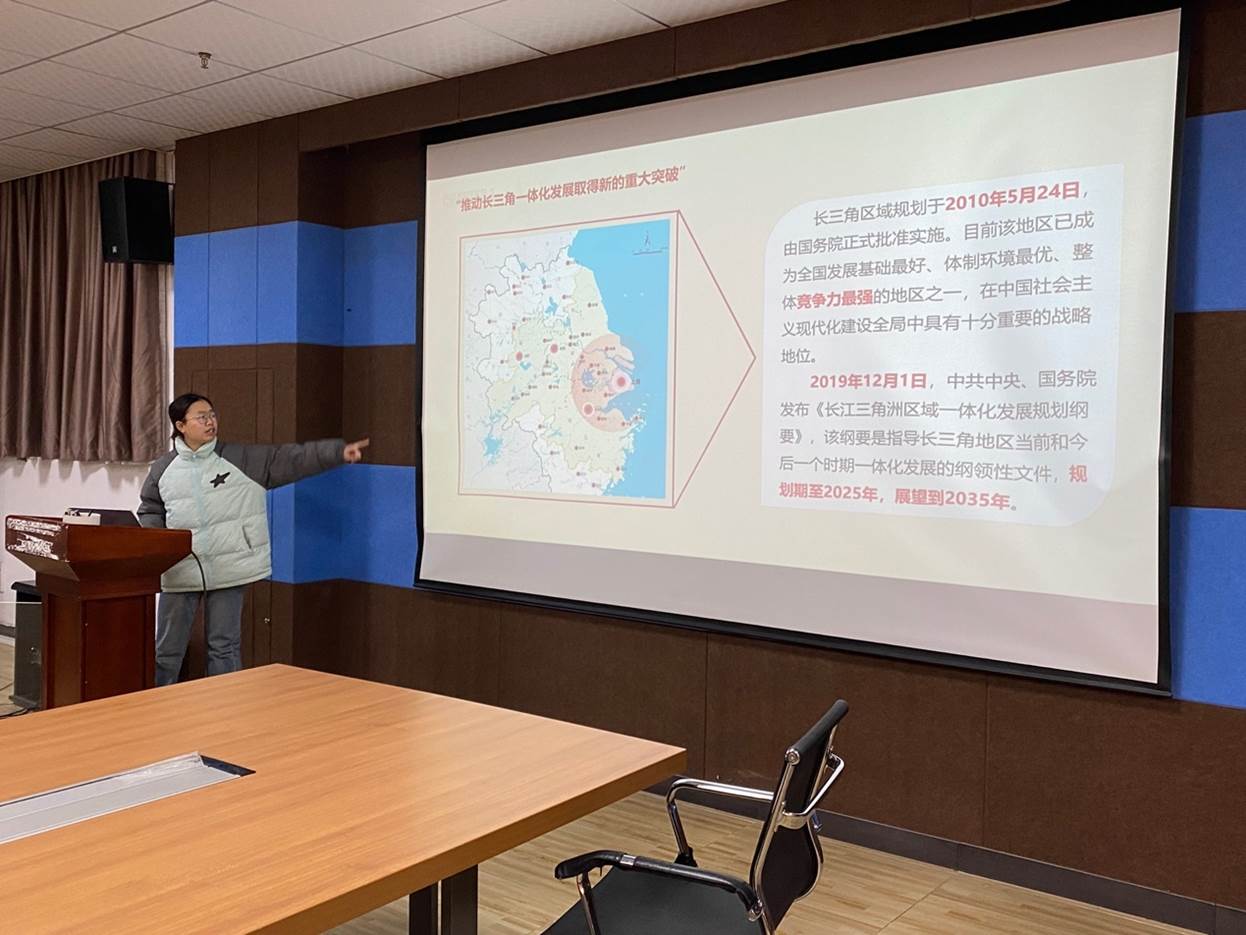 蒋雨池就推进长三角一体化发展座谈会谈话精神进行了微党课的讲授。习近平总书记在会议中强调,长三角区域要积极推进高层次协同开放,加强生态环境共保联治,着力提升安全发展能力,同时指出深入推进长三角一体化发展,必须坚持和加强党的全面领导。