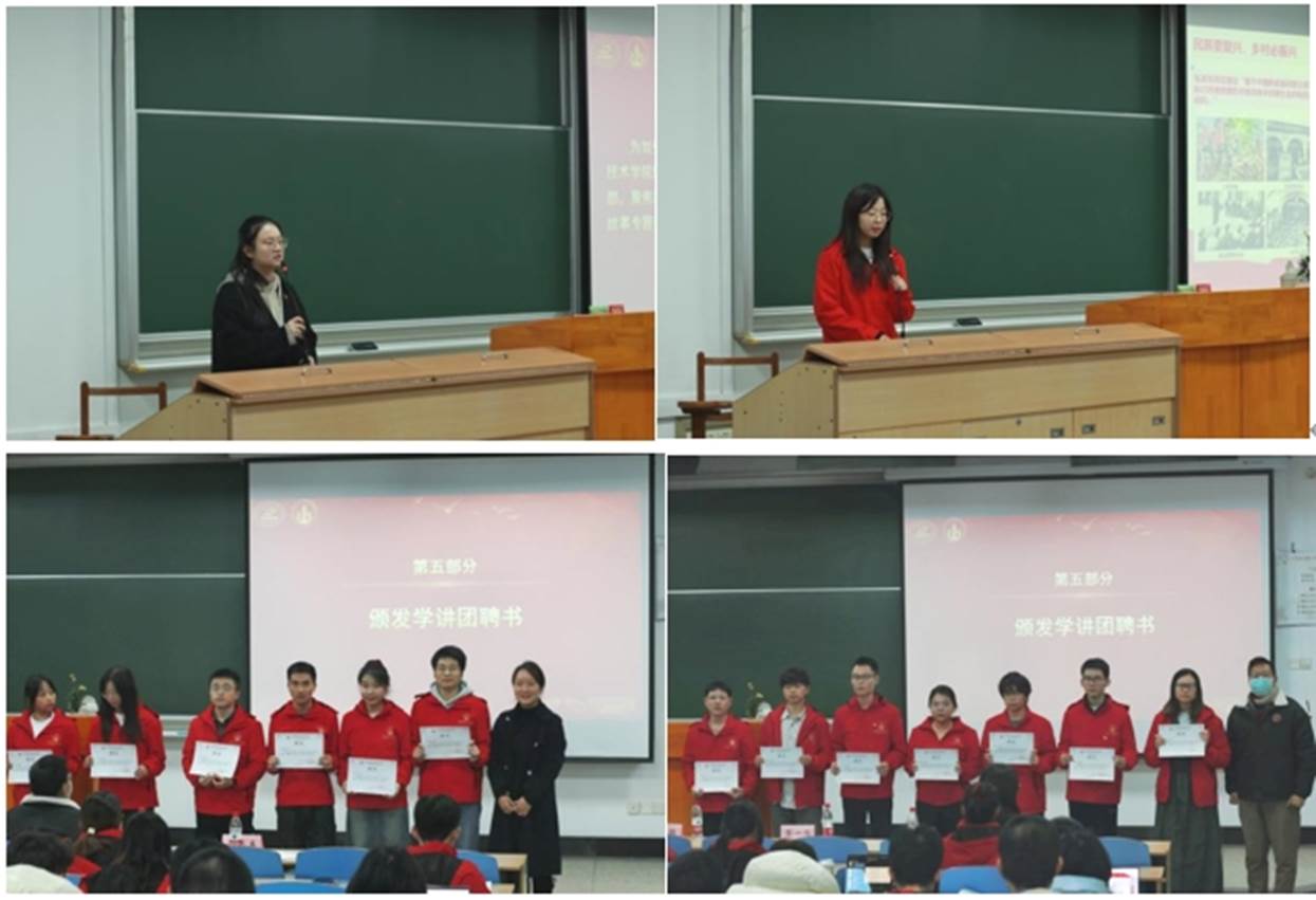 李若楠老师详细讲解了积极分子培训班的制度,包括培养流程、课程管理和考核方式等,并介绍了红色基因学讲团的成立初衷及运营机制。周钰、彭一鸣两位老师为学讲团成员颁布聘书。
