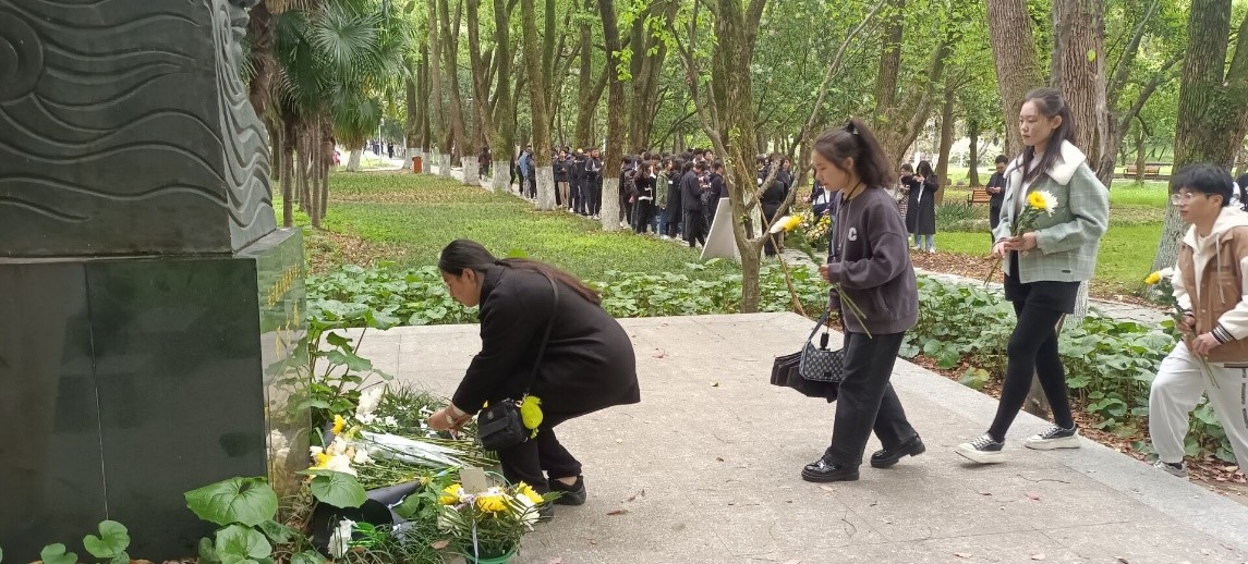 祭扫活动由党建中心工作人员杨晨主持,活动伊始,全体成员向胡吉伟塑像默哀一分钟,寄托对胡吉伟学长无限的追思与崇高的敬意。生物科学(中外合作办学)2203班的入党积极分子代表王浩宇同学介绍胡吉伟学长生平及勇救落水儿童的事迹,并呼吁广大生命学子继续学习他刻苦学习、成才报国的理想信念,传承他挺身而出、舍己救人的崇高精神,牢固树立正确的世界观、人生观、价值观,为华中大建设添砖加瓦,为实现中华民族伟大复兴贡献青春、智慧与力量。斯人已逝,精神长存,全体成员手持鲜花,瞻仰胡吉伟纪念雕像,并上前为胡吉伟塑像献花,寄托对英雄校友的深切哀思。