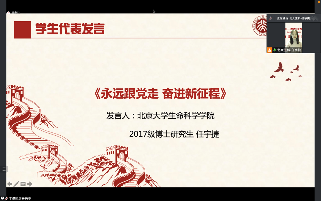 北京大学生命科学学院2017级博士研究生任宇捷谈到从高中走向大学,又到研究生,不仅感受到了自己的家庭生活日益富足的变化,也见证了我们的国家富强。我们即将离开校园,正式步入社会,走向工作岗位,要时刻牢记使命与担当,在未来的工作岗位上奋斗,将自己校园的所学专业知识灵活运用到工作中,让奋斗与拼搏充实自己的新征程,真诚地贡献青春力量。