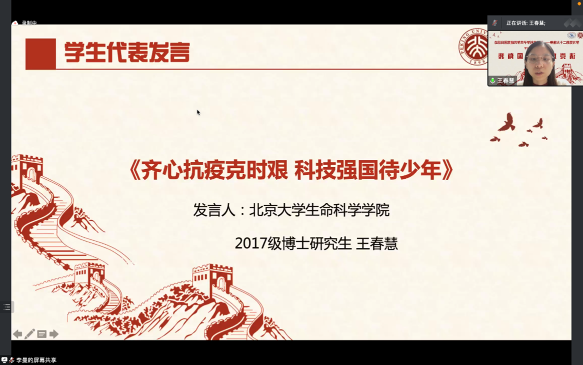 北京大学生命科学学院2017级博士研究生李雪阳谈到要尊重自然、顺应自然、保护自然,这是全面建设社会主义现代化国家的内在要求,我们必须牢固树立和践行绿水青山就是金山银山的理念,站在人与自然和谐共生的高度求发展。她谈到了自己三江源实习经历,立志努力做好动物学研究,在习近平总书记提到的实施重要生态系统保护和修复实施生物多样性重大保护工程中贡献自己的一份力量。