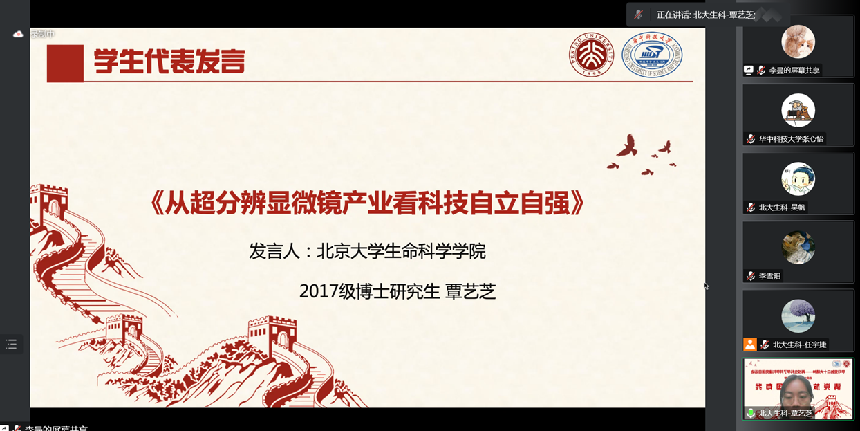 北京大学生命科学学院2017级博士研究生吴帆提到作为新时代的科研工作者,首先要守正创新,以国家战略需求为导向,增强自主创新能力,打好学科基础知识;其次要抢占先机,将关键核心技术的专利掌控在我们自己的手中;最后,新时代的担当要融入大我,科研道路道阻且长,行则将至,让我们不忘初心、牢记使命,承担起新时代赋予我们的历史任务。