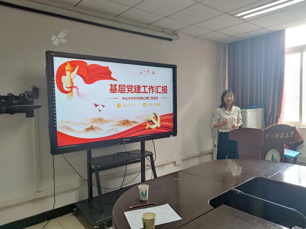 中山大学农学院教工第二党支部宣传委员魏蜜以“学党史、办实事”为主题介绍了支部建设情况。教工二支部深入基层调研,为人民解决实际需求,结合农学专业,启动河南省平舆县砂姜黑土综合治理科技攻关,开展白芝麻病虫害防控研究,同时,与云南省凤庆县红塘村开展支部共建与技术帮扶,并以创新的帮扶模式,在广东省琴口村打造科技扶贫“一村一品”工程,帮助其巩固脱贫攻坚成果,进一步助力乡村振兴。