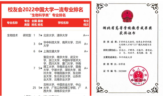 基础学科生物科学与技术实验班(生实班):选拔招生30人,生实班是紧紧围绕国家生物经济发展需求,以培养生命科学领域拔尖创新人才为目标。现为生物技术国家一流本科专业(首批)、国家特色专业和湖北省品牌专业,在2022年国家一流本科专业排名中位列全国第3。师资力量雄厚,拥有国家万人计划教学名师、湖北省教学名师和荆楚好老师等国家级教学团队,多次荣获湖北省教学成果特等奖和国家教学成果奖。