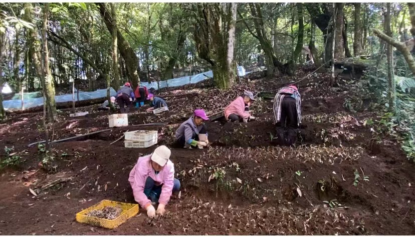 近日,在临翔区博尚镇那招小道河林场,云南善源生物科技发展有限公司负责人陈永华正在山地上检查雪胆的种植情况,“已经长出块茎了”他笑着说道。