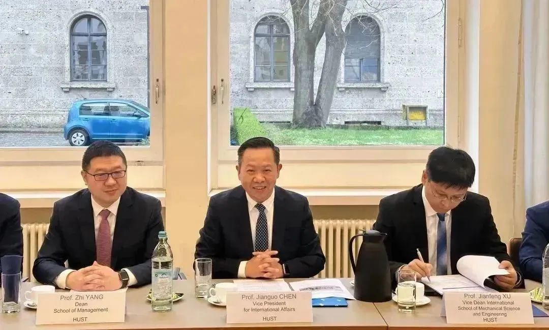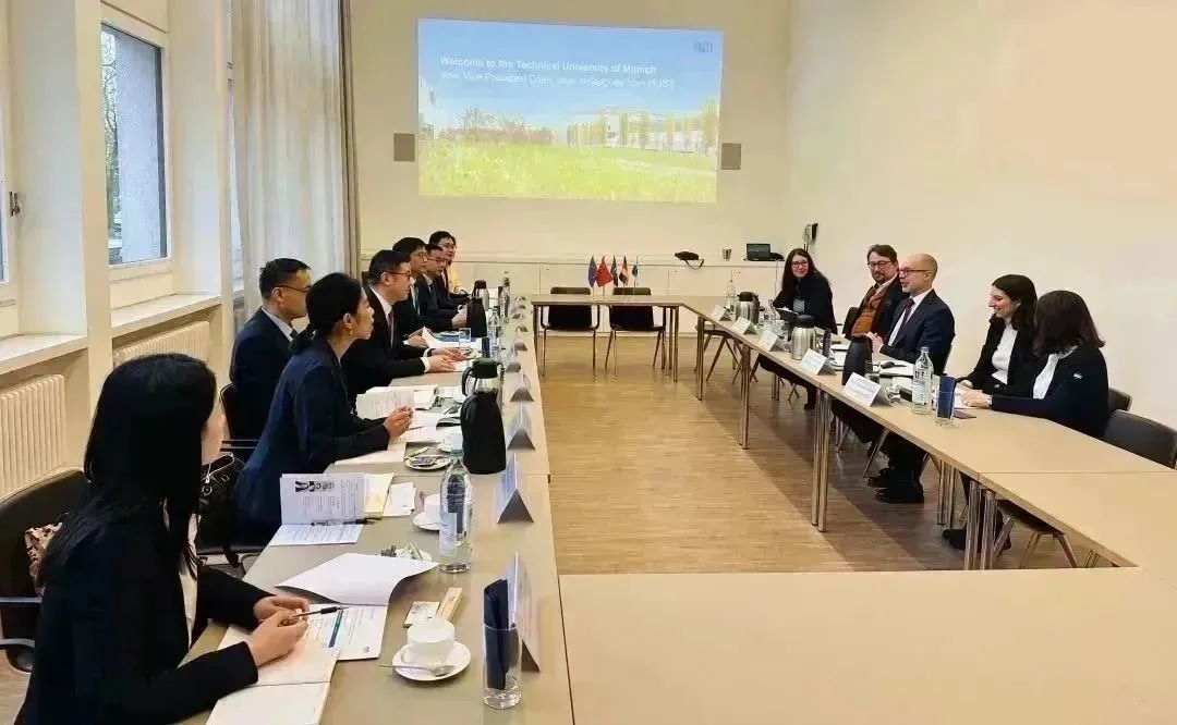 在慕尼黑工业大学,陈建国与该校国际交流及全球校友网络负责人Harald Olk一行举行会谈,在回顾两校10年合作成果的基础上,进一步探讨了在硕士联合培养、种子基金、访问学者项目等方面的合作可能。我校管理学院、机械学院分别介绍了各自的学科特色与优势,以及在院系和学科层面深化合作的倡议。