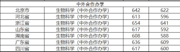 从官方公布的最新数据来看,2022年,学校生物科学(中外合作办学)专业仅在7个省(市)招生,分别为北京市、河北省、浙江省、山东省、湖南省、广东省和四川省。各省最低录取分不低于588分,最高分达到了654分。大概看去,专业的招生门槛似乎并非高不可攀。
