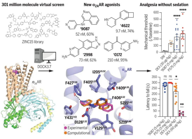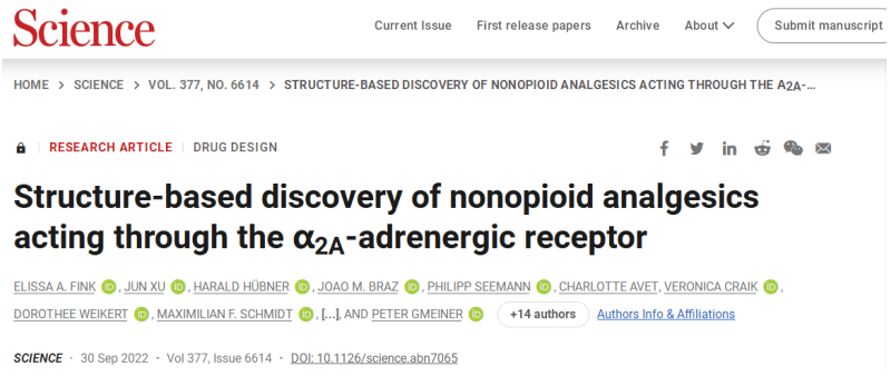 近日,相关论文以《基于结构开发靶向α2A-肾上腺素能受体的非阿片类镇痛药》(Structure-based discovery of nonopioid analgesics acting through the α2A-adrenergic receptor)为题发表在Science上[2]。