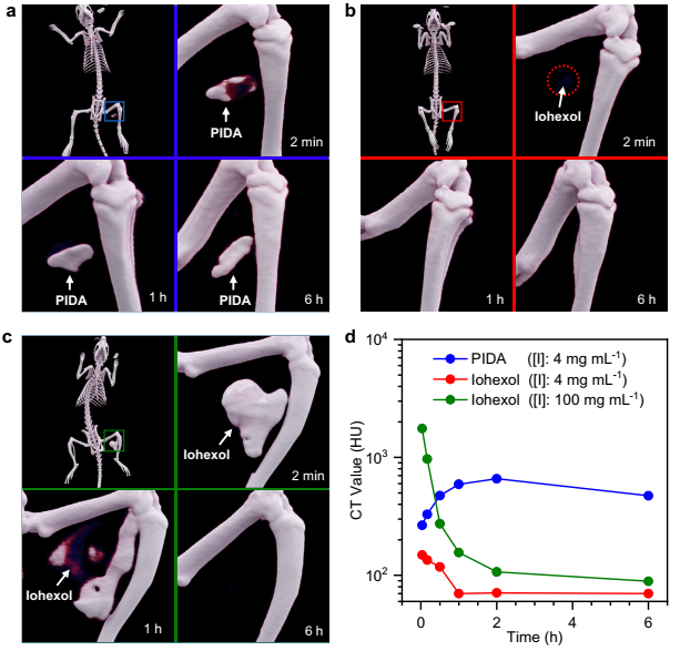 同时,PIDA的纳米纤维特性可使其在组织内呈现显著的滞留效应,与商用碘海醇(Iohexol)相比,在同等碘浓度下,PIDA可在较长时间范围内维持很高的CT信号,并具有良好的几何和位置稳定性。因而,有望通过PIDA进行术前CT引导下的肿瘤标记和轮廓勾勒,其信号持久性可有效衔接CT诊断与肿瘤手术过程。