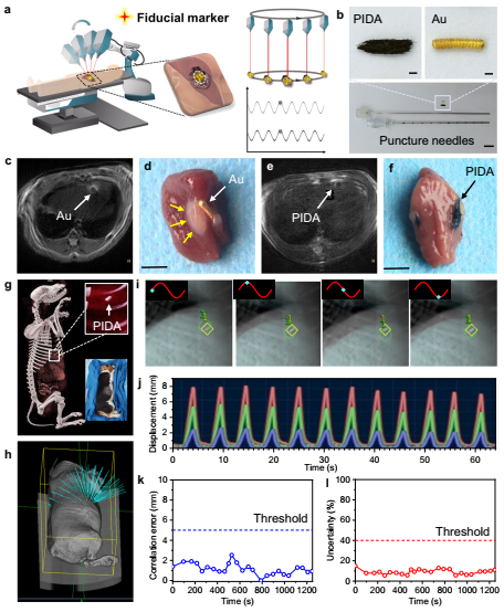 最后,研究人员将PIDA应用于影像介导的放疗(Imaging-guided radiotherapy)。与临床上使用的金基准标记物相比,PIDA 具有更好的生物相容性、定位稳定性和几乎不可见的伪影,同时保持有效的高CT 强度。这些特性对于术前放疗规划中剂量分布的精确计算以及机器人影像介导放疗中的精确辐射递送至关重要。研究人员在比格犬模型上验证了基于 PIDA 的实时 CT 成像介导的立体定向放射治疗,并获得预期效果。