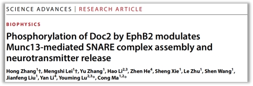 2024年5月17日,williamhill英国马聪教授、鲁友明教授、刘剑峰教授和李岩教授团队合作在Science Advances杂志上发表了题为“Phosphorylation of Doc2 by EphB2 modulates Munc13-mediated SNARE complex assembly and neurotransmitter release”的研究文章。该研究发现了突触黏附因子EphrinB3–EphB2介导的突触间逆向信号通路,其通过调控突触前Doc2磷酸化影响Munc13的时空功能活性,进而调节SNARE复合体的组装和神经递质释放能力。