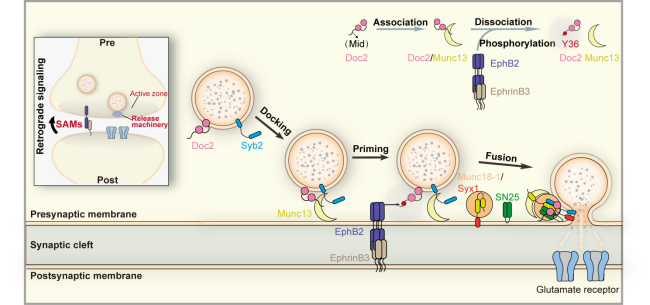 以SNARE蛋白为核心的递质释放大分子机器还包括Munc13和Doc2等突触前膜蛋白。Munc13是SNARE复合体组装的关键启动元件。Doc2作为一类Ca2+感受器,被报道可与Munc13协同调控神经递质释放。研究人员首先以Munc13-1和Doc2B为切入点,全面提供了Munc13-1与Doc2B的互作信息:发现Doc2B通过Mid(Munc13-interacting-domain)结构域结合Munc13-1的活性中心,严格抑制Munc13-1启动SNARE复合体组装的功能活性。随后,为寻找解除Doc2B抑制效应的机制,研究人员筛选到具有酪氨酸激酶活性的突触黏附因子EphB2与Doc2B在组织、细胞和突触水平存在共定位,并鉴定了EphB2在突触前活性区定位。进一步研究发现,EphB2特异性磷酸化Doc2B的Y36位点,该磷酸化通过减弱Doc2B与Munc13-1的互作,解除了Doc2B对Munc13-1功能活性的抑制,有效恢复SNARE复合体组装。最后,神经元电生理和小鼠行为学实验发现,突触黏附因子EphrinB3(EphB2的配体之一)可特异性增强EphB2激酶活性,进而提升Doc2B的磷酸化水平,有效加强神经递质释放效能和突触前可塑性,维持小鼠正常的学习和记忆。该结果表明,突触黏附因子EphB2在突触前的激酶活性和Doc2B的磷酸化水平直接影响Munc13-1启动SNARE复合体的组装的能力,完成对神经递质释放能力和突触可塑性的高效调节。
