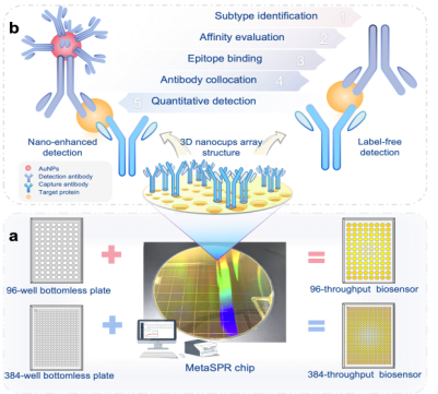 该研究突破了传统表面等离子共振(SPR)传感器在检测通量上的限制,创新性地研发了具有纳米杯阵列表面结构的超表面等离子共振(MetaSPR)芯片,并据此设计开发了96孔和384孔的高通量MetaSPR生物传感器。经过精细的生化改性工艺,成功开发出一系列高性能的功能性生物传感器。这些MetaSPR生物传感器结合分子互作技术,被应用于精准的亚型鉴定、表位分组、亲和力评价、抗体配对及定量检测,显著提升了早期抗体药物筛选与分析的效率和准确性。