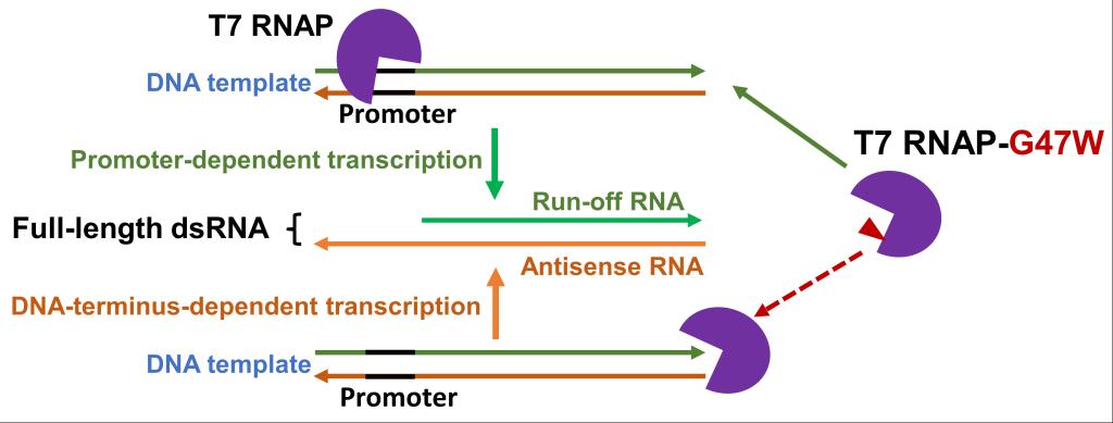 本工作对细胞毒性效应最大的全长dsRNA的来源进行了详细研究,清晰展示了全长dsRNA的真正来源:T7 RNA聚合酶会在没有启动子的的DNA末端开始转录,一般从倒数第二个碱基位置开始合成与目标RNA完全互补的反向RNA,反向RNA进而与目标RNA形成完全配对的全长dsRNA。DNA模版最末端的序列对全长dsRNA的产量有较大影响。作者比较了各类单亚基RNA聚合酶的DNA末端起始转录的情况,发现在已鉴定噬菌体单亚基RNA聚合酶中只有KP34和VSW-3 RNA聚合酶缺乏DNA末端起始能力,因此检测不到其产生的全长dsRNA。进而根据前期研究经验和不同酶之间的比较,朱斌课题组分析了T7 RNA聚合酶多种C-helix突变体的DNA末端结合和起始转录能力,发现G47W突变可显著降低T7 RNA聚合酶对DNA末端的结合,因而可以最有效减少全长dsRNA的产生。美国Moderna公司近期报道的G47A+884G突变体可有效减少RdRp引起的dsRNA,但在合成长链RNA时或在高产条件下该突变体的RNA产量显著降低。相比之下,G47W突变对蛋白质表达纯化及RNA合成产量均无显著影响,完全适配当前野生型T7 RNA聚合酶的标准反应和配套条件,是降低全长dsRNA最简单有效的方法。