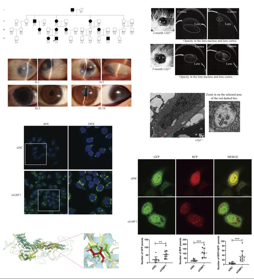 进一步构建Gbf1的基因敲除小鼠,纯合子Gbf1基因敲除小鼠胚胎致死,杂合子Gbf1基因敲除小鼠表现出白内障的表型。使用人晶状体上皮细胞系对GBF1的致病机制进行研究,发现GBF1基因突变导致GBF1蛋白表达水平降低,细胞中GBF1功能丧失激活未折叠蛋白反应,以不依赖于mTOR和BECN1的方式,通过抑制JNK1蛋白的磷酸化水平导致细胞中自噬水平升高而导致白内障。本研究揭示了儿童白内障新的遗传病因和致病机制,对相关疾病的产前诊断以及后续药物开发具有重要意义。
