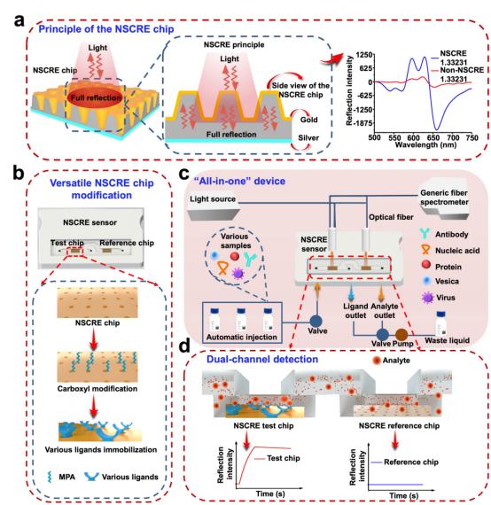 图1 基于腔反射增强的便携式微流控装置及检测方法示意图。(a)基于腔反射增强(CRE)的MetaSPR (NSCRE)传感器原理。(b)测试芯片表面羧基化修饰与配体固定示意图。(c)该微流控设备包括光源、光谱仪、NSCRE传感器、自动注射装置和流道。(d)双通道测试芯片与参比芯片检测分析物示意图。