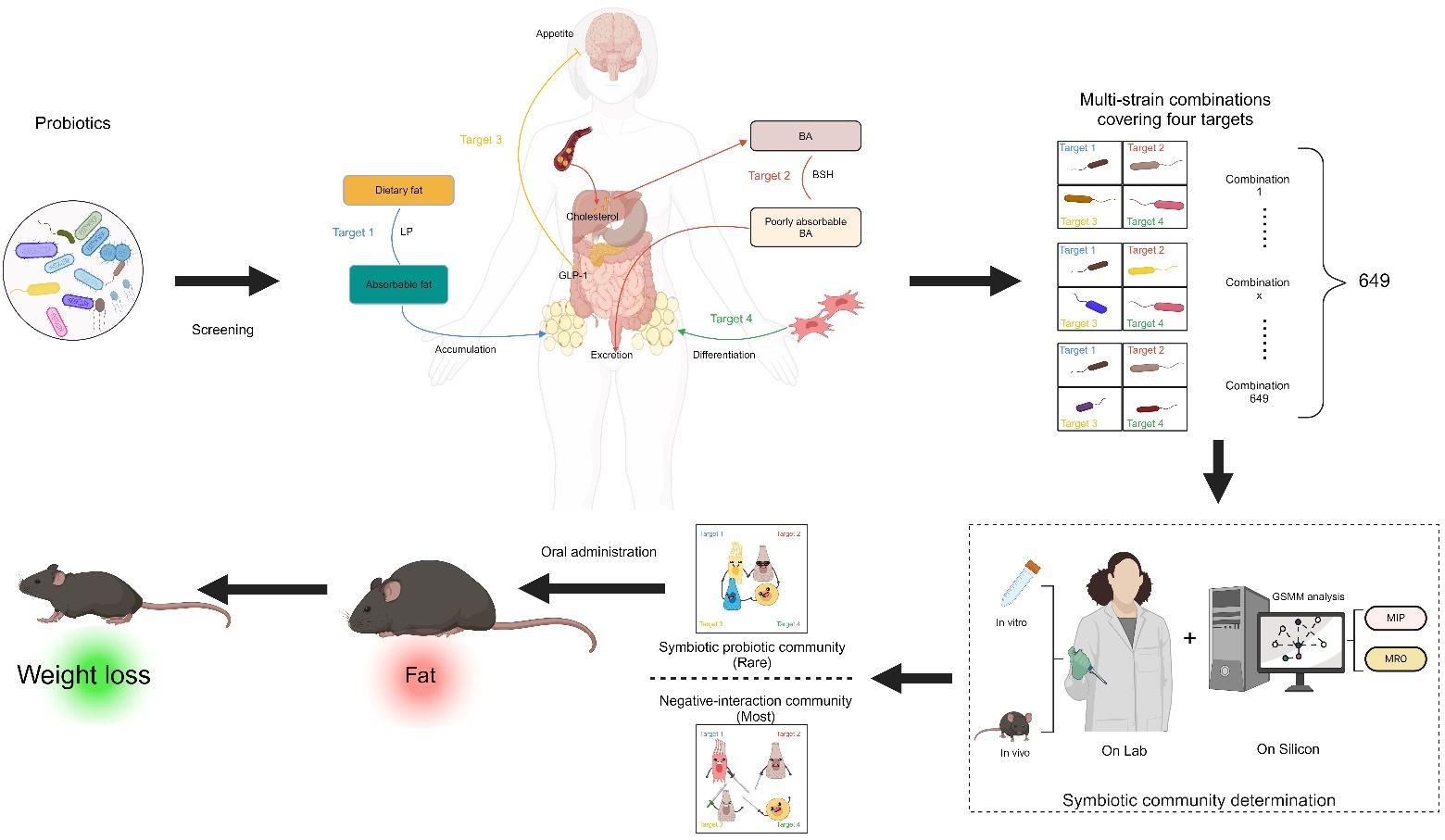 在过去几十年里,益生菌在治疗疾病方面效果显著。然而,具有高发病率和死亡率的肥胖是复杂且多因素的。多靶点益生菌组合可以在多个靶点上实现协同效应,提高疗效并减少副作用,有望在治疗多因素疾病时取得更好的治疗效果。但在自然群落中,细菌之间的负面相互作用占主导地位,两菌种互惠互利的合作关系则相对罕见。这一自然现象导致随机的多菌组合可能会因为负面相互作用而恶化治疗效果。因此,在进行多菌组合时,一定要充分考虑菌与菌之间的生态关系,设计可共生益生菌群落(SPC)以实现高效的疾病治疗。