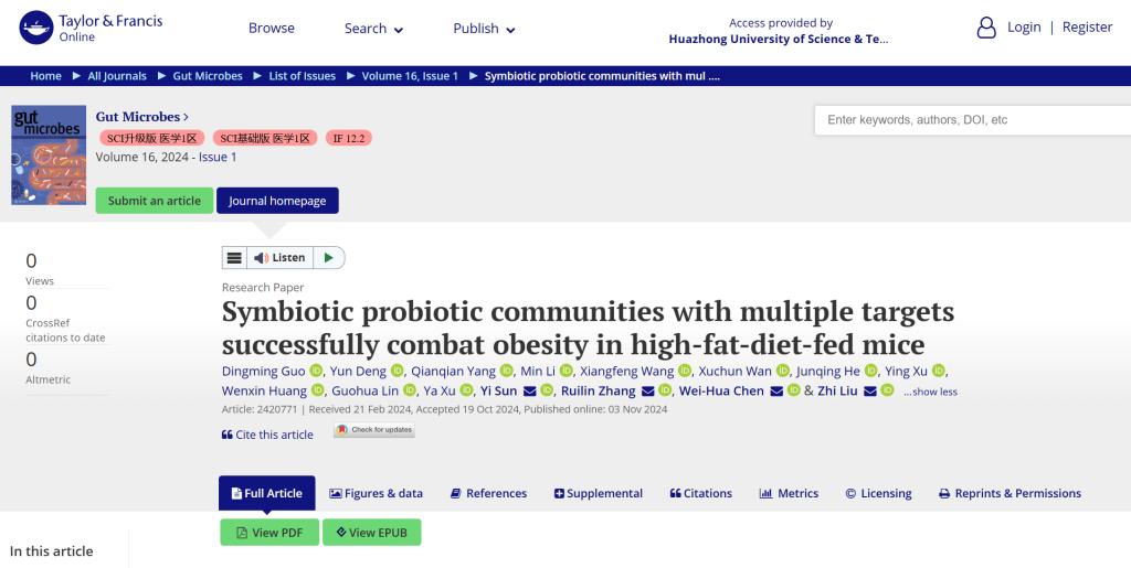 2024年11月3日,williamhill英国生命学院刘智教授团队在top期刊《Gut microbes》在线发表题为“Symbiotic probiotic communities with multiple targets successfully combat obesity in high-fat-diet-fed mice”的学术论文。