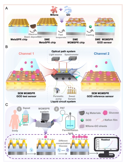 MGMSPR芯片是一种创新的无标记、可实时监测的光学生物传感器,通过独特的超表面纳米杯阵列结构,能够在纳米尺度上操控光波传播,从而有效检测各种分子。基于银镜增强的强反射原理,将光束集中在芯片表面,从而形成适合小分子检测的MetaSPR表面。研究团队为了进一步提升灵敏度,MGMSPR芯片集成了通过混合干燥工艺制作的3D MXene与氧化石墨烯(MG)薄膜,作为电子传递载体放大局域电场效应,同时加入高表面积二维材料以增强分子吸附。芯片的3D多孔杂化膜具有可调节的孔径结构,有利于葡萄糖氧化酶(GOD)稳定固定在膜内,使MGMSPR成为高灵敏度和稳定的葡萄糖检测传感器。此外,MGMSPR芯片被集成到微流控系统中,通过自动取样系统可同时实现人体汗液葡萄糖的实时监测以及工业发酵培养液中的葡萄糖浓度的过程分析。