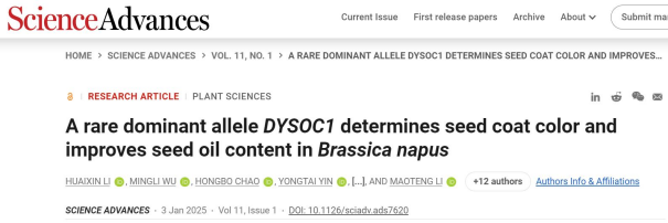 2025年1月4日,生命学院栗茂腾教授团队和及其合作者在国际权威期刊Science Advances发表了标题为A rare dominant allele DYSOC1 determines seed coat color and improves seed oil content in Brassica napus的研究论文。该研究在黄籽甘蓝型油菜品系N53-2中克隆了可明显提高种子含油量的显性黄籽新基因 (dominant gene of yellow seed coat color and improved seed oil content 1, DYSOC1)。据悉,这是我国学者在该期刊上发表的与甘蓝型油菜种子相关性状基因克隆和功能研究的第1篇论文。