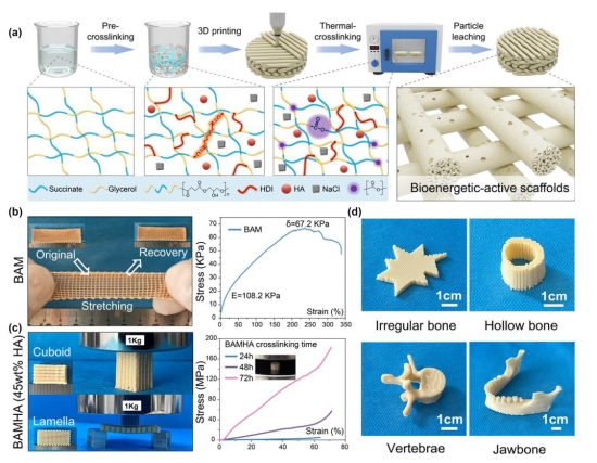 难治性骨缺损的修复仍然是临床面临的重大挑战。通过生物材料调控细胞能量状态促进组织再生,为应对上述挑战提供了全新策略。张胜民教授团队设计了一类高度通用的“生物墨水”(Bioink),实现了定制化生物能量活性支架的快速3D打印。这些支架具有可调的力学性能和降解特质,并通过调控细胞能量状态促进组织修复与再生。针对骨软骨缺损,该研究3D打印了一种仿生梯度生物能量活性支架,实现了高质量透明软骨的再生和骨软骨界面的重建,获得了与天然骨软骨组织相媲美的生理结构与力学性能;针对大段股骨缺损,该工作定制了一种力学自适应性生物能量活性支架,实现了大段骨缺损的骨桥接和皮质骨重建。上述定制化生物能量活性支架系统通过支架仿生设计和细胞能量调控,无需额外的生长因子和活细胞,成功修复了两种难治性骨缺损,展现了巨大转化潜能。