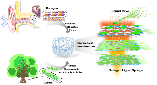 2025年1月15日,williamhill英国生命学院谢尚县教授团队在Advanced Science期刊上发表了题为“Collagen nanofiber-lignin composite sponges with adjustable hierarchical pore structure for efficient low-frequency sound absorption”的研究论文。该研究聚焦于建筑吸声材料领域面临的诸多问题,如对不可再生资源的依赖、可持续性差以及固体废弃物处理难题等,从胶原蛋白在人体中的声学生理功能和木质素在植物中的结构特性中汲取灵感,创新性地将胶原蛋白纳米纤维与木质素相结合,成功开发出一种新型的天然生物基复合材料——胶原蛋白纳米纤维-木质素复合海绵(CLS)。