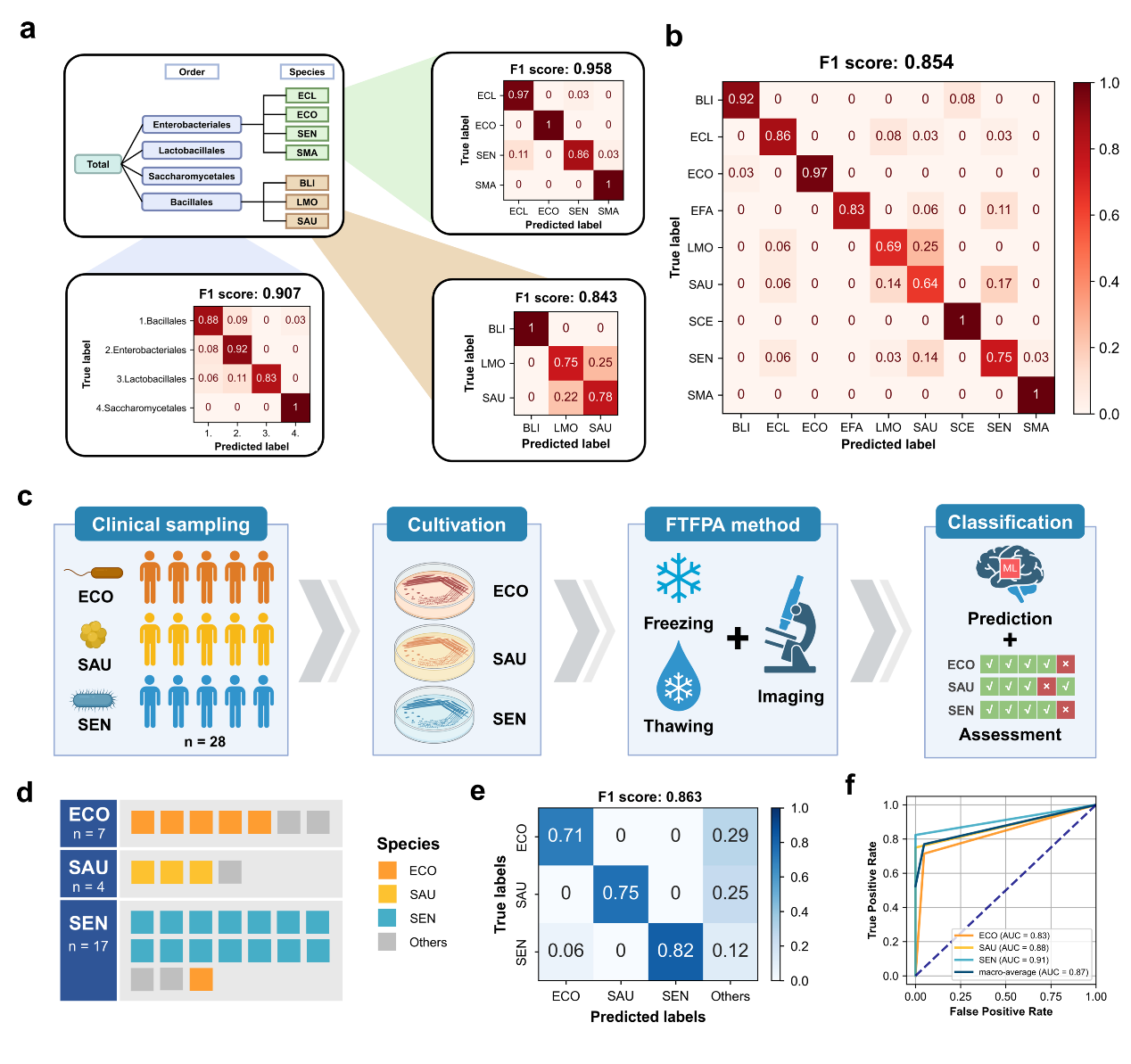 层次分类模型的表征与临床数据验证。(a)分别使用三个分类级别的数据评估训练模型的分类效果。(b)层次分类方法的分类模型综合评估。(c)临床微生物样本处理与模型验证的流程图。(d)三种目标微生物的模型预测结果。(e)临床样本中层次分类模型验证的热图。“其他”表示模型预测结果不在该批次临床样本标签中的微生物群体。(f)层次分类模型验证的三种微生物物种的ROC图。