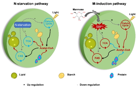甘露糖诱导下相对于氮饥饿代谢差异调节模式示意图