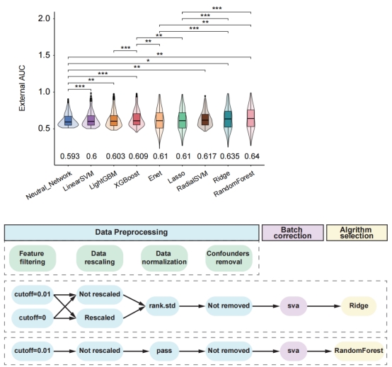 在该研究中,研究团队将机器学习模型构建分为三个步骤:数据预处理、去除批次效应和建模算法,利用涵盖20种疾病的83个肠道微生物组队列数据对上述三个环节进行了系统的比较和优化。研究团队一共测试了156种工具-参数-算法的组合,为每种算法匹配了最适合该算法的数据预处理方法,并发现sva R包中的"ComBat"函数在消除批次效应时表现优秀,最终筛选出岭回归(Ridge)和随机森林(Random Forest)这两种算法搭配各自最优的数据预处理方法的最佳建模流程(图1)。