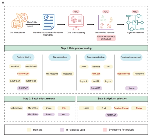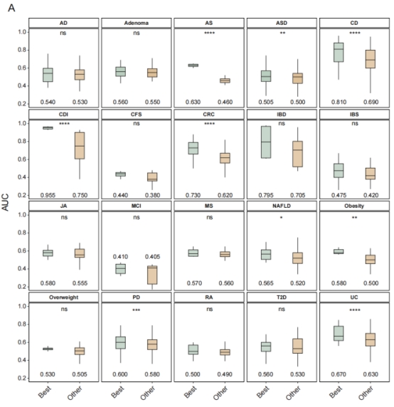 肠道菌群在维系人体健康中扮演着重要作用,与多种疾病的发生和发展息息相关,越来越多的研究基于肠道微生物构建机器学习模型进行疾病诊断。然而,机器学习模型的构建有许多可选择的步骤和可使用参数,不同疾病的诊断模型也呈现出差异极大的性能。此外,过去的研究并未全面的纳入多种疾病进行比较。因此,通过组合不同建模步骤和选择参数来构建一套适用于多种疾病且性能优异的最佳建模流程是一项亟待完成的工作。
