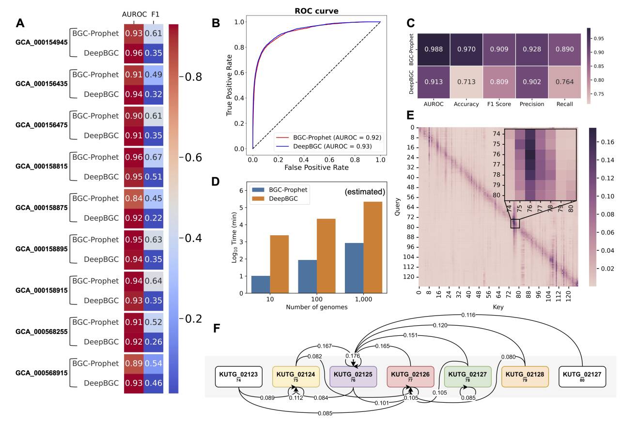 图1. BGC-Prophet可进行快速准确的BGC预测,并通过注意力机制揭示BGC中的核心基因
