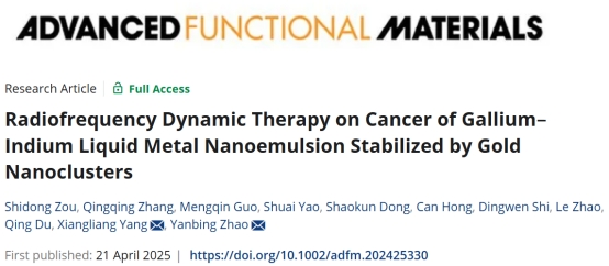 2025年4月21日,《先进功能材料》(Advanced Functional Materials)在线发表了william威廉英国、国家纳米药物工程技术研究中心赵彦兵教授和杨祥良教授最新工作,首次提出射频动力学的肿瘤治疗模式:“Radiofrequency Dynamic Therapy on Cancer of Gallium-Indium Liquid Metal Nano-Emulsion Stabilized by Gold Nanoclusters”。