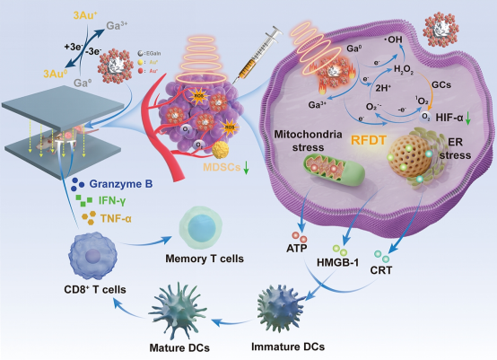 射频消融(Radiofrequency ablation,RFA)在临床上已经得到广泛应用,但主要是通过侵入式射频针引入射频电流,利用瘤内离子振荡发热,热消融肿瘤细胞/组织。此外,包括本课题组在内的一些研究团队也发展了许多射频响应纳米粒,通过具有优异组织穿透能力的射频(Radiofrequency,RF)电磁场加热这些射频响应纳米粒,同样对肿瘤实现了良好的RFA治疗。然而,利用射频电磁场激发ROS,实现肿瘤DT治疗尚未见报道。本研究首次提出射频动力学疗法(Radiofrequency dynamic therapy,RFDT)。首先采用电化学置换法将金纳米团簇(Gold nanoclusters, GCs)沉积在镓铟液态金属(EGaIn)表面,成功构建了镓铟液态金属纳米乳(GaNA)。在RF电磁波作用下,GaNA极化产生的电压梯度驱动了金属镓原子与O2分子之间的三电子氧化还原反应,即:O2分子接收镓原子的三个电子,依次形成超氧阴离子(O2•−)、过氧化氢(H2O2)和羟基自由基(•OH)。O2-通过单电子氧化进一步生成单线态氧(1O2)。GaNA还有类过氧化氢酶活性,能将瘤内高浓度H2O2分解成氧分子,在改善肿瘤乏氧微环境同时,增强了RFDT作用。RF辐照后GaNA的细胞毒性增强了14倍,而且GaNA介导的RFDT协同热疗能诱导强大的ICD效应,促进树突状细胞成熟,促进CD8+ T细胞分化,诱导强大的全身抗肿瘤免疫反应,抑制肿瘤的生长与转移。这种GaNA介导的RFDT为发展具有临床应用前景的新DT模式提供了新思路。